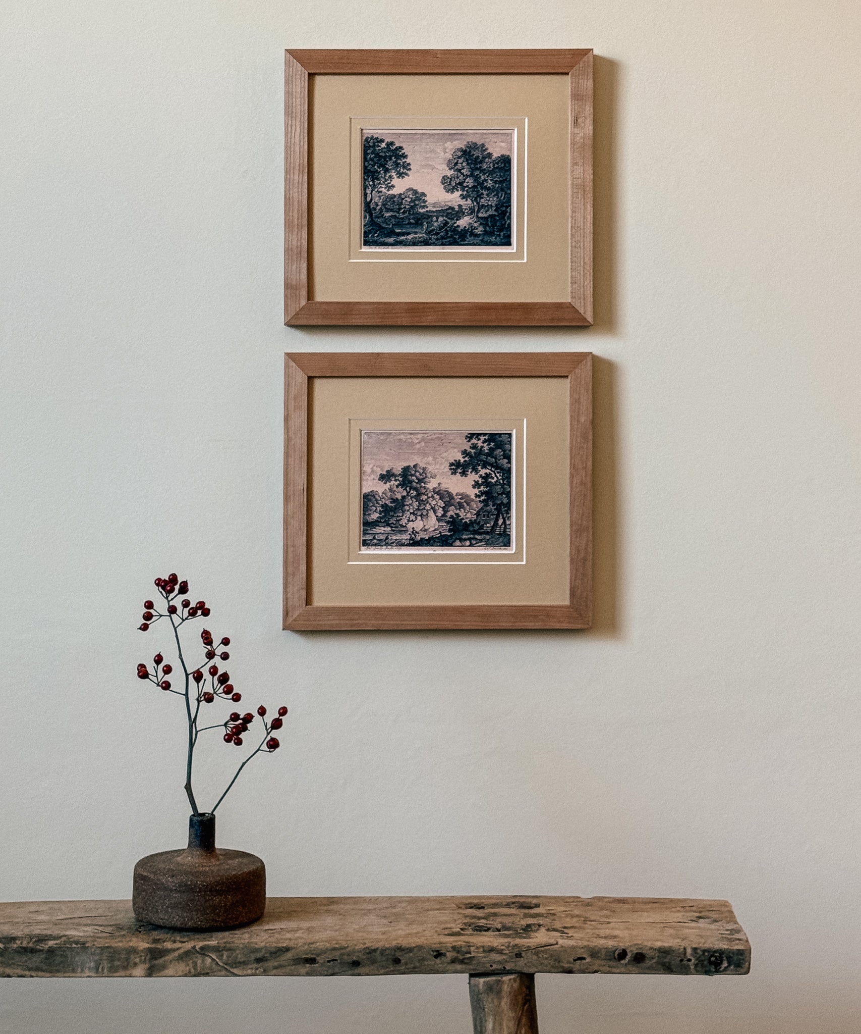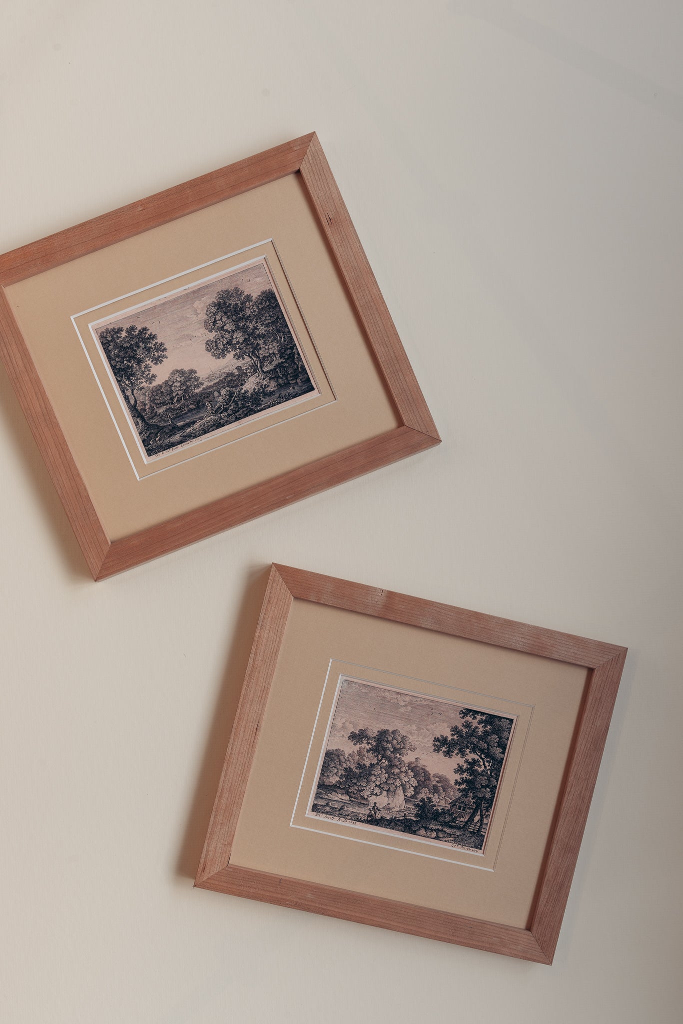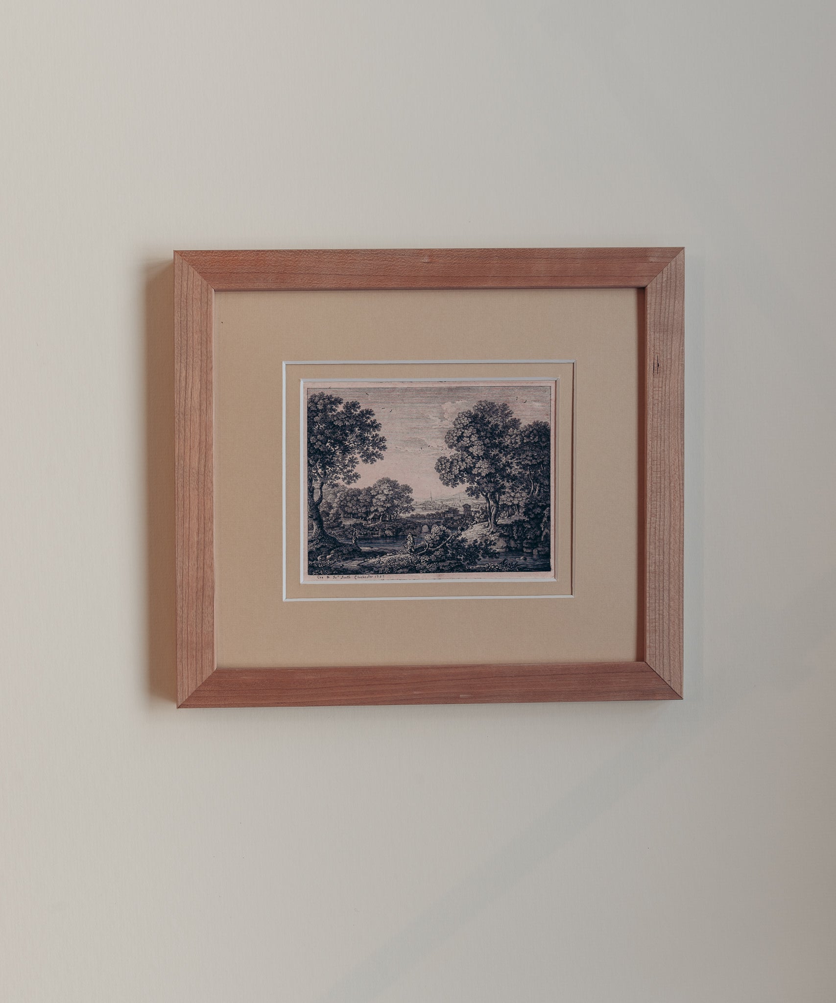 The Ancient Woodlands are a pair of antique engravings from the mid 1700s depicting beautiful English landscapes which have been restored and reprinted. Encase in a handmade frame of raw cherry wood with a honey coloured double mount. These pieces are available individually or as a pair.