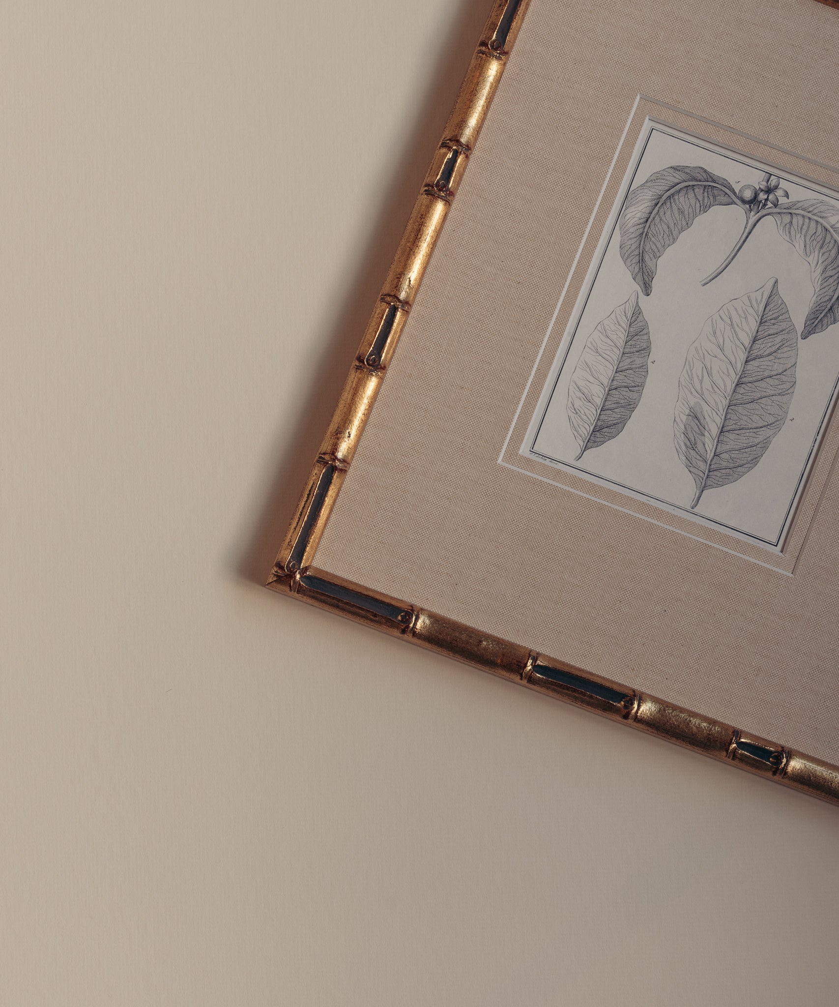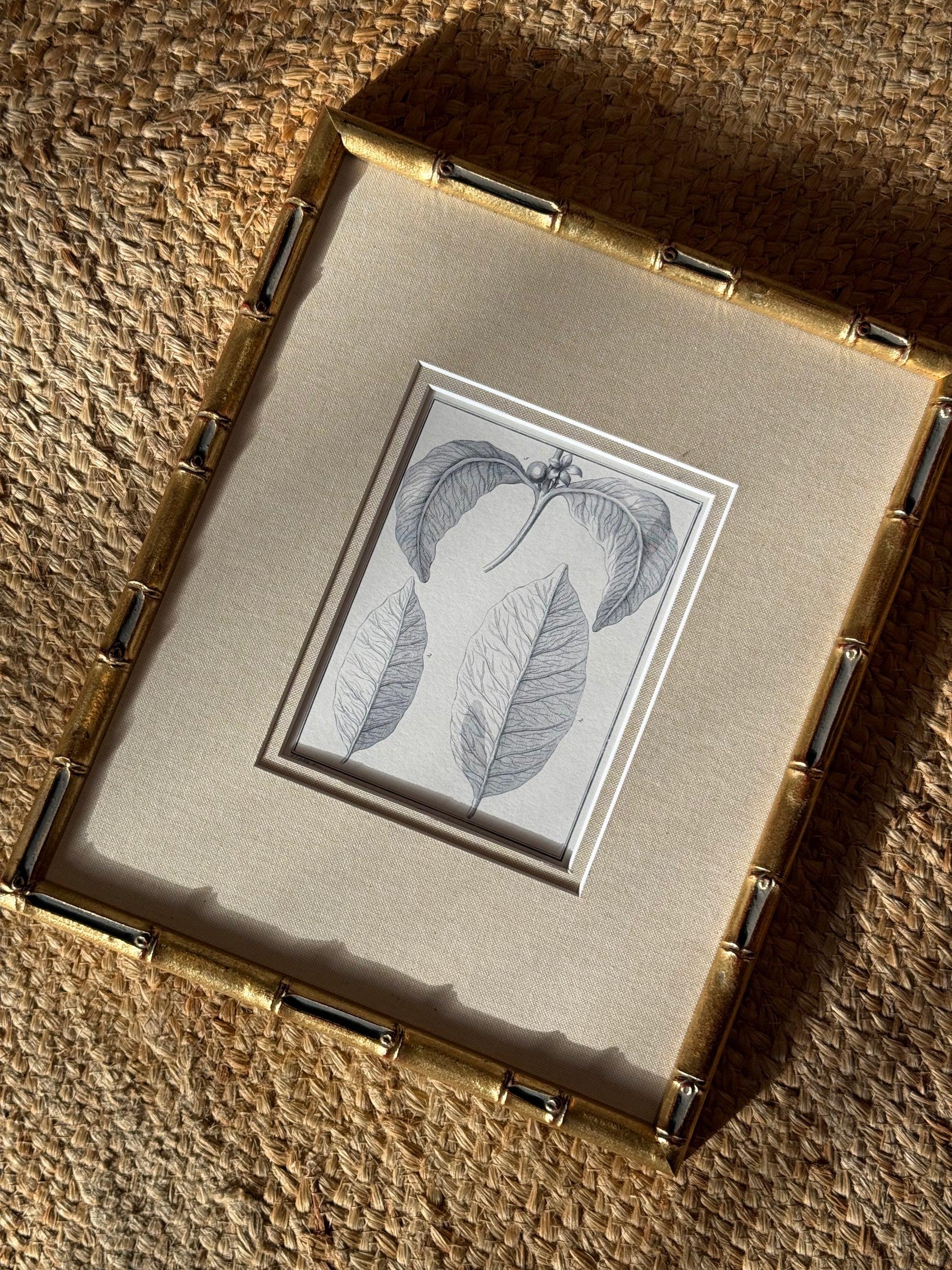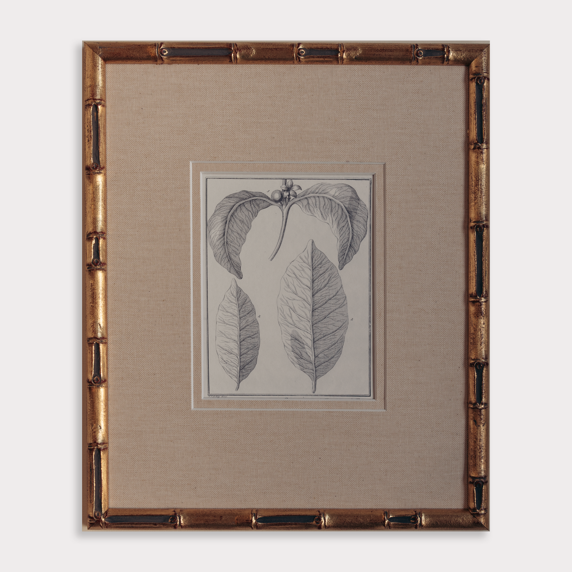 The Coffee Plant is beautiful reprint of an antique original print from the 1700s. Showcasing the fruit and leaves and the world's most sort after bean. Encased in an antique gold effect bamboo frame with double mount of wheat linen this is the perfection addition to brighten up your morning coffee routine.