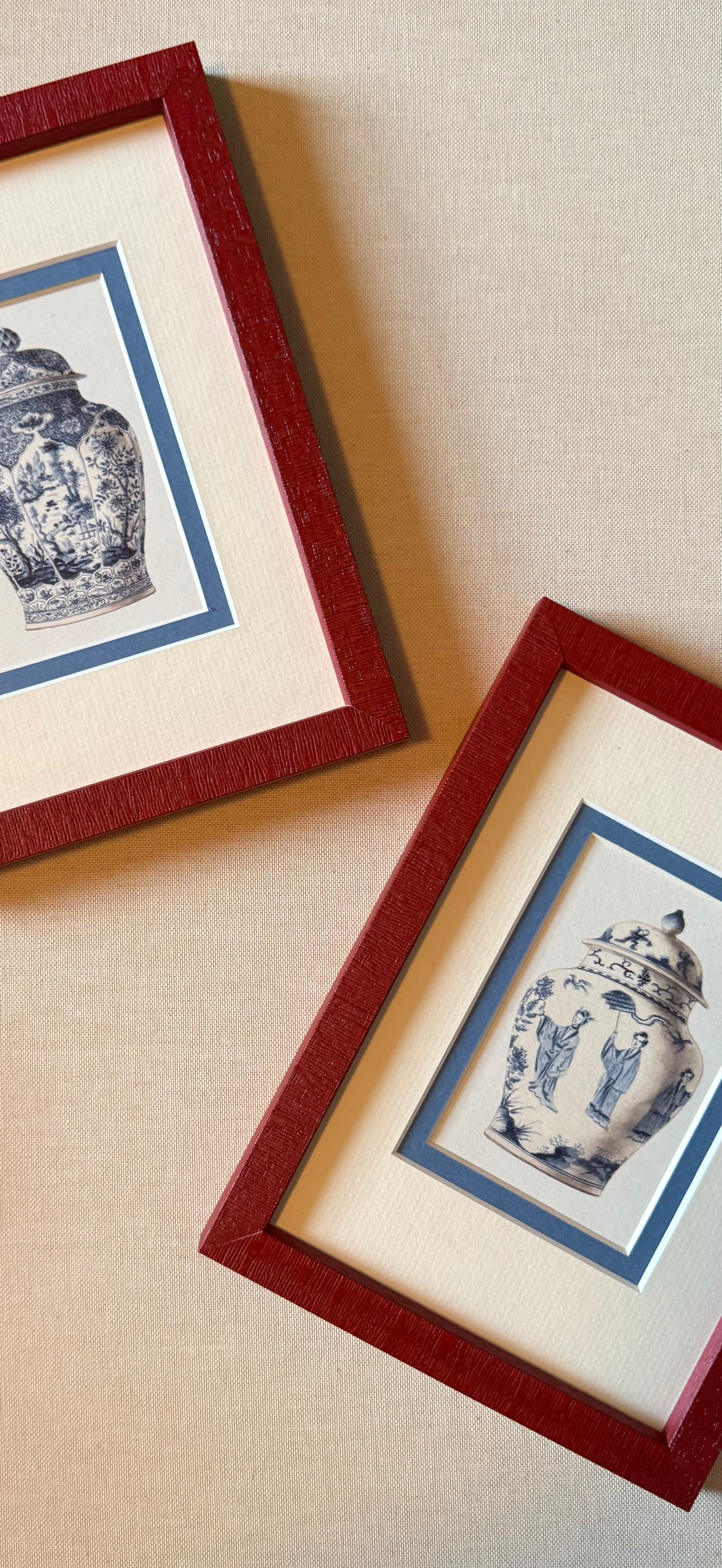 These miniature reprints of two ginger jars are playfully framed in a deep red wooden frame with a double mount of off white and pompadour blue. These are reprints taken from work complete between 1770-1785 and is referred to as French Chinoiserie.