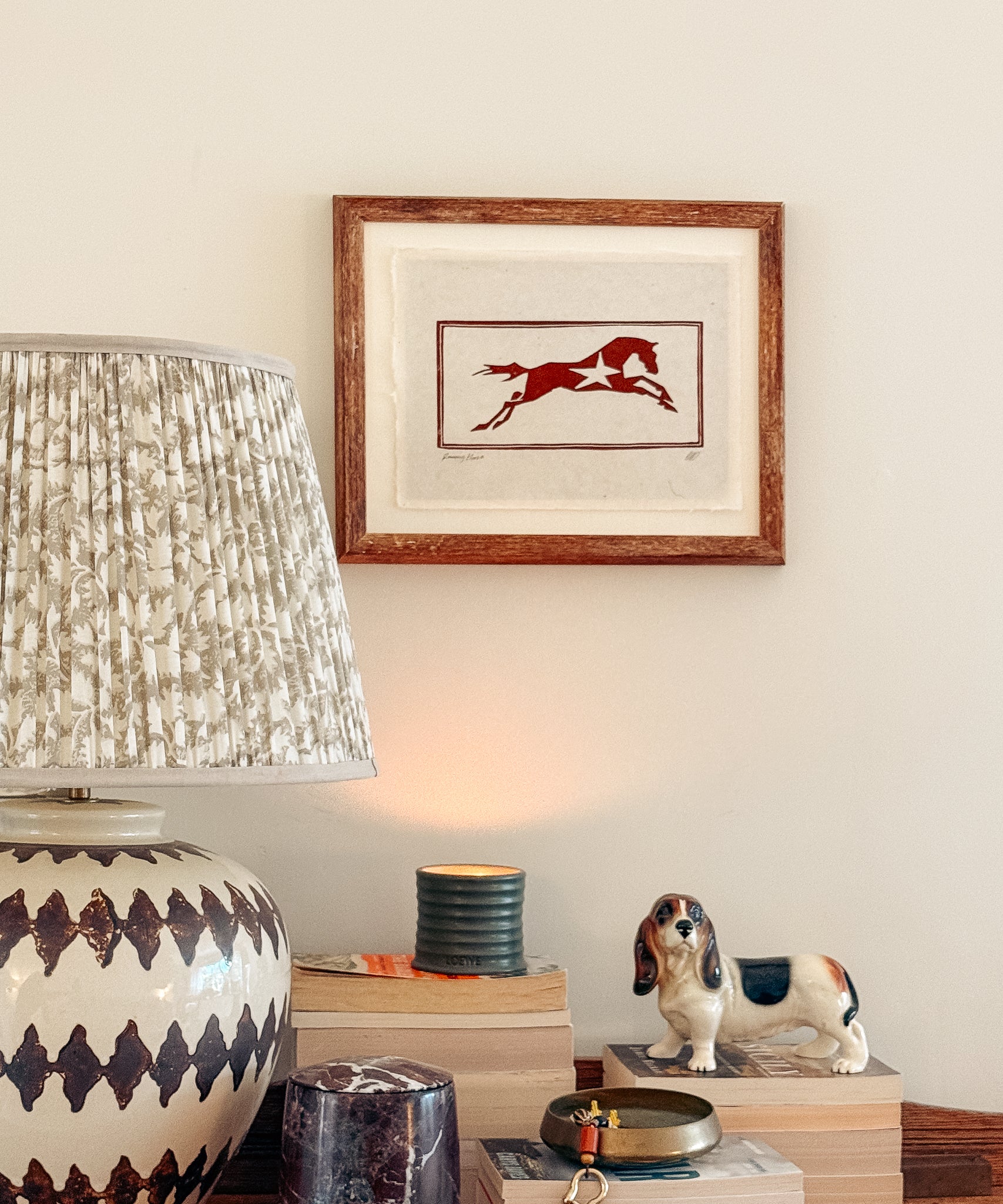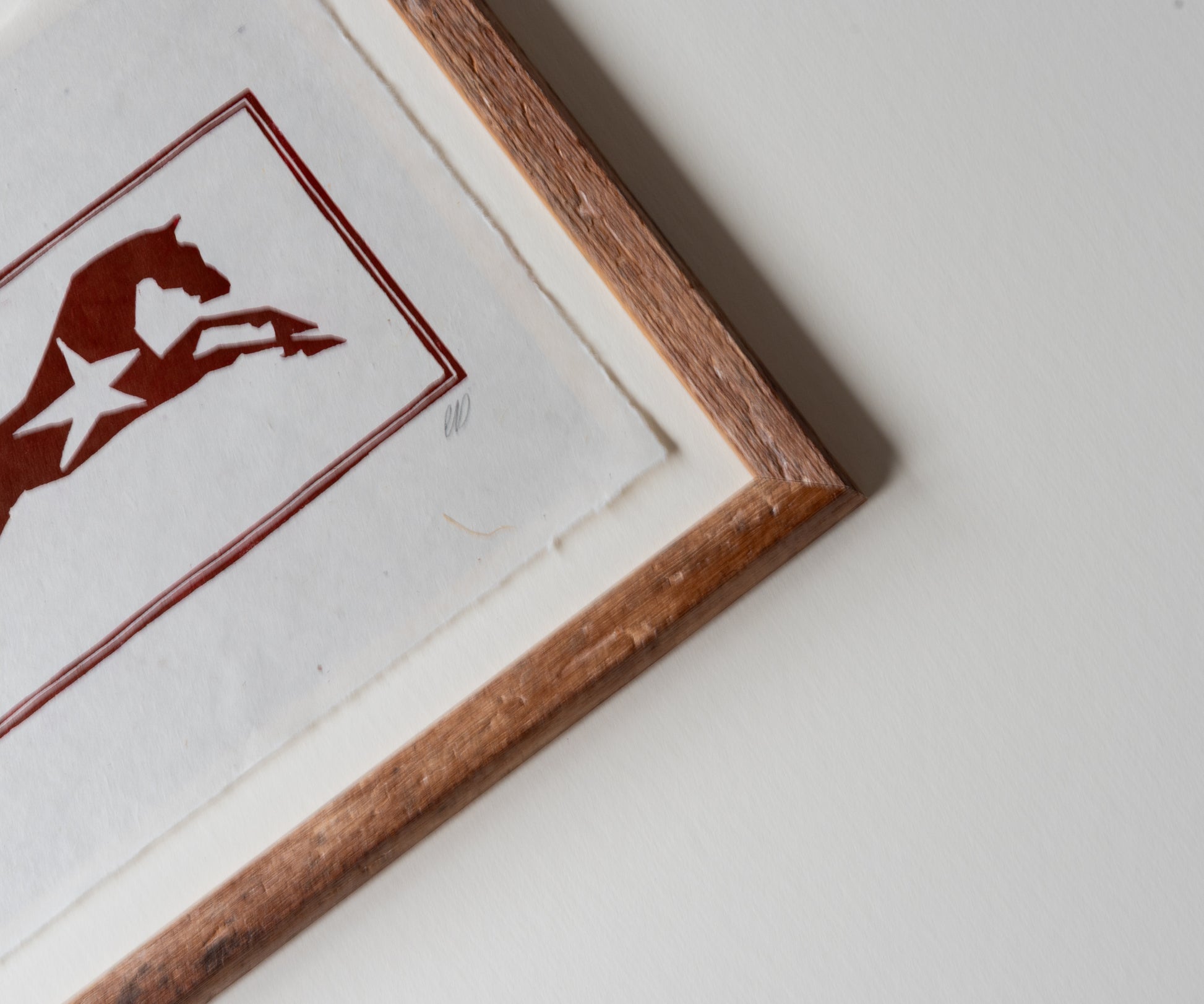 This beautiful woodblock print by Lode prints is carved by hand and bursting with personality, this piece captures a horse mid-flight—legs stretched, mane flowing embezzled with a star. The bold, earthy maroon caligo ink is hand printed on Nepalese Lokta paper. Adding to its rustic charm we have encased the print in a beautiful rustic battered wood effect frame adding to its country house charm.