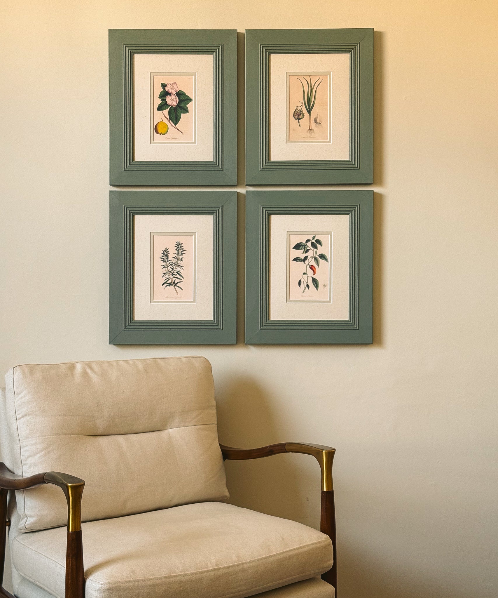 These handmade frames have been hand painted in Farrow & Ball's 'Card Room Green', which is perfectly complimented by the double mount of oatmeal linen and willow green. These pieces are available individually or as a set of four and nine. We have pre-selected the set of four but no worries if you would like to change that, just pop us a message and we can switch them up for you.
