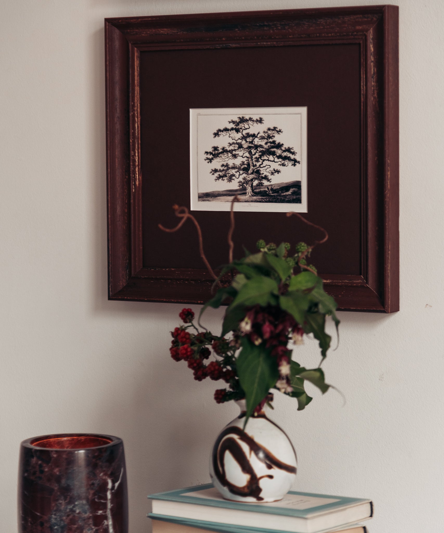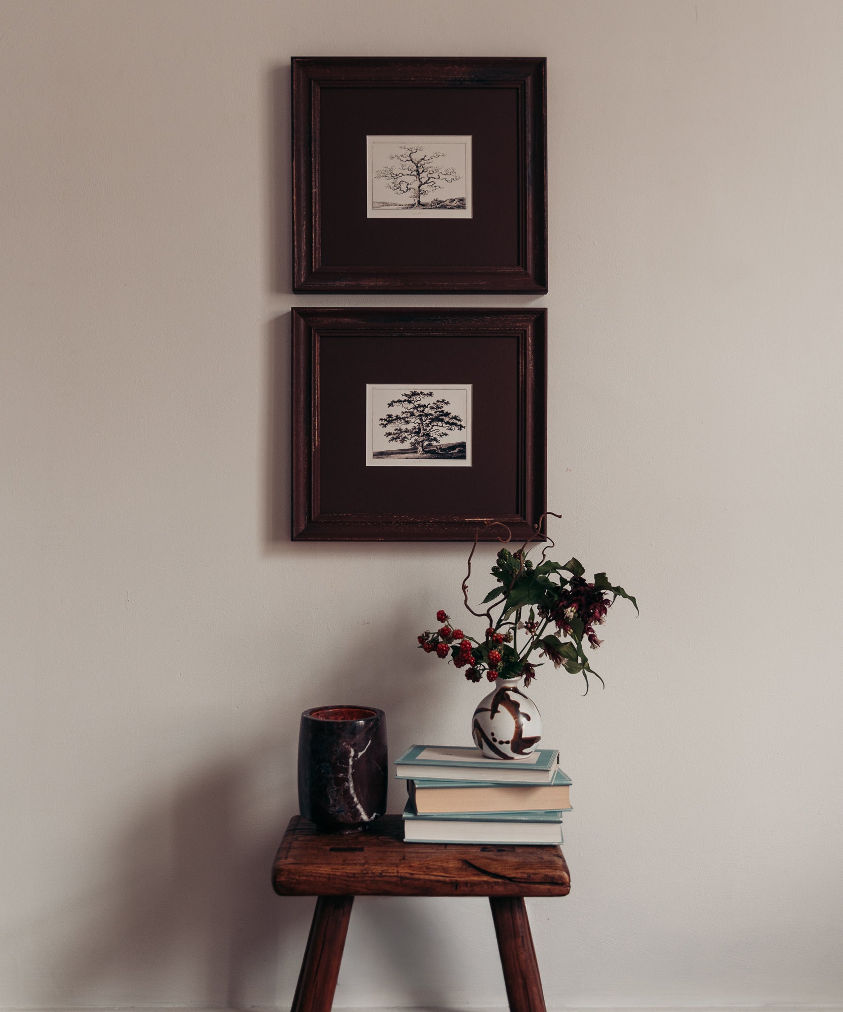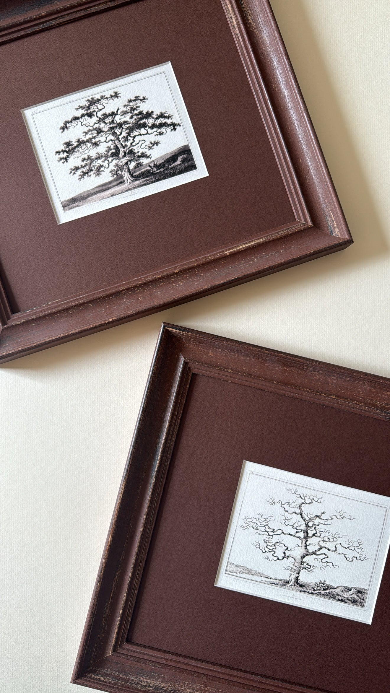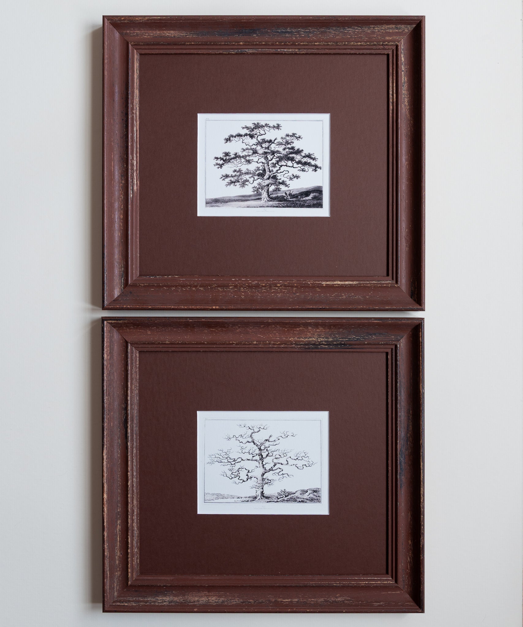 In a handmade frame of a rich chocolate brown with tonal pecan mount board, these make a striking pair but work just as beautifully individually. The perfection addition to a hallway, living area or bar.