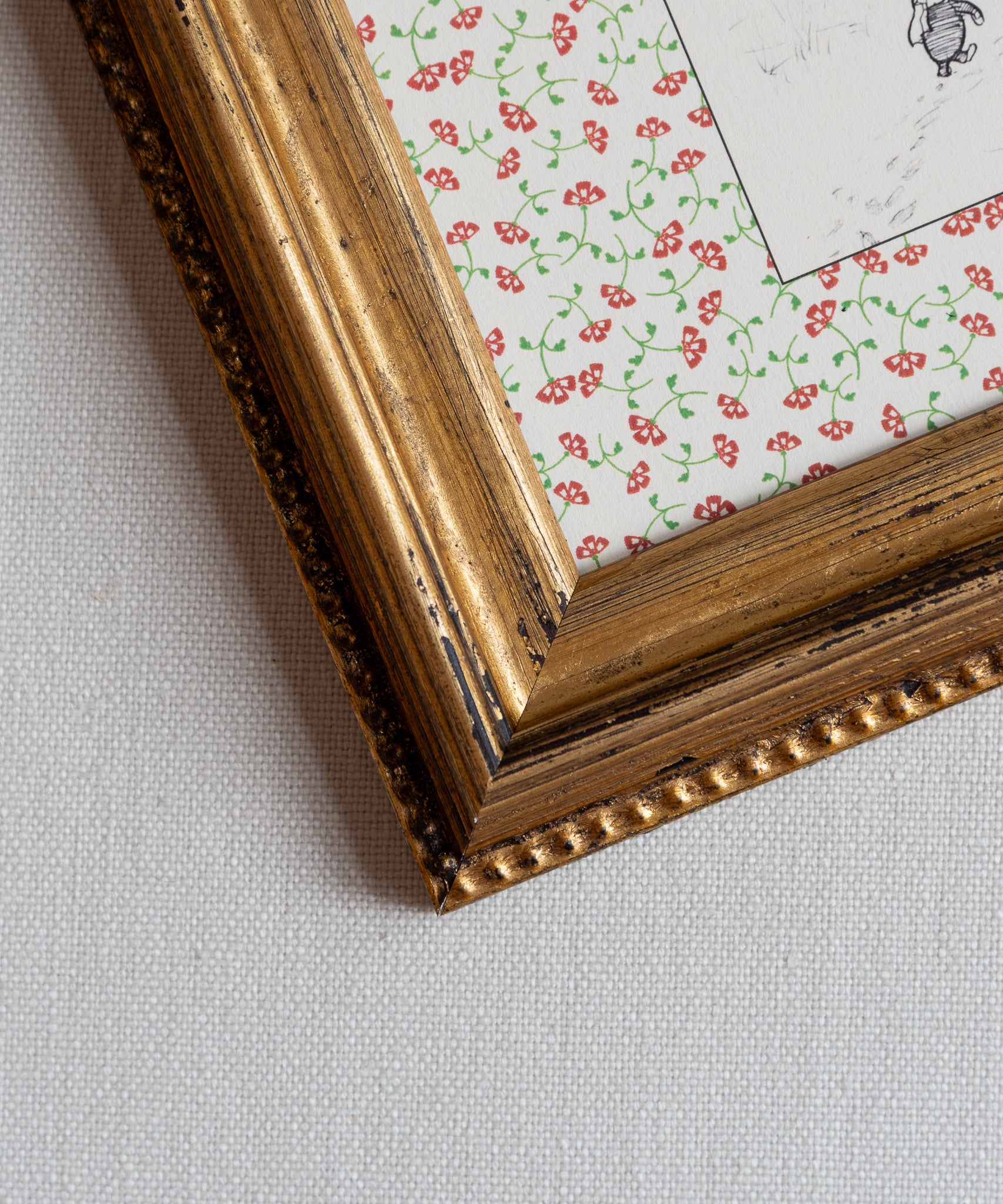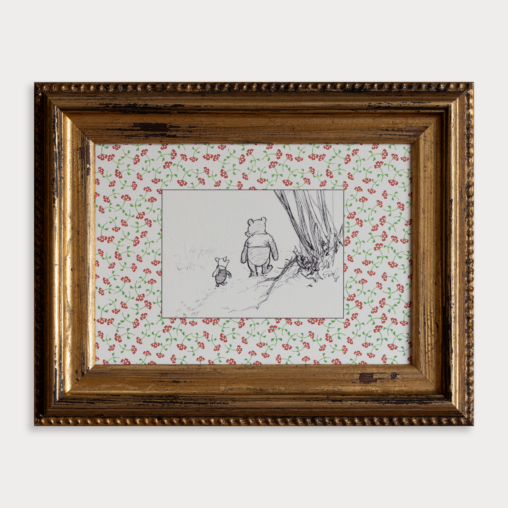The Winnie & Piglet reprint shows the iconic duo deep in conversation, most likely about honey! This beautiful reprint has been made all the sweeter with a whimsical floral print. The handmade frame is a beautiful rustic antique gold effect frame with bobble detail.