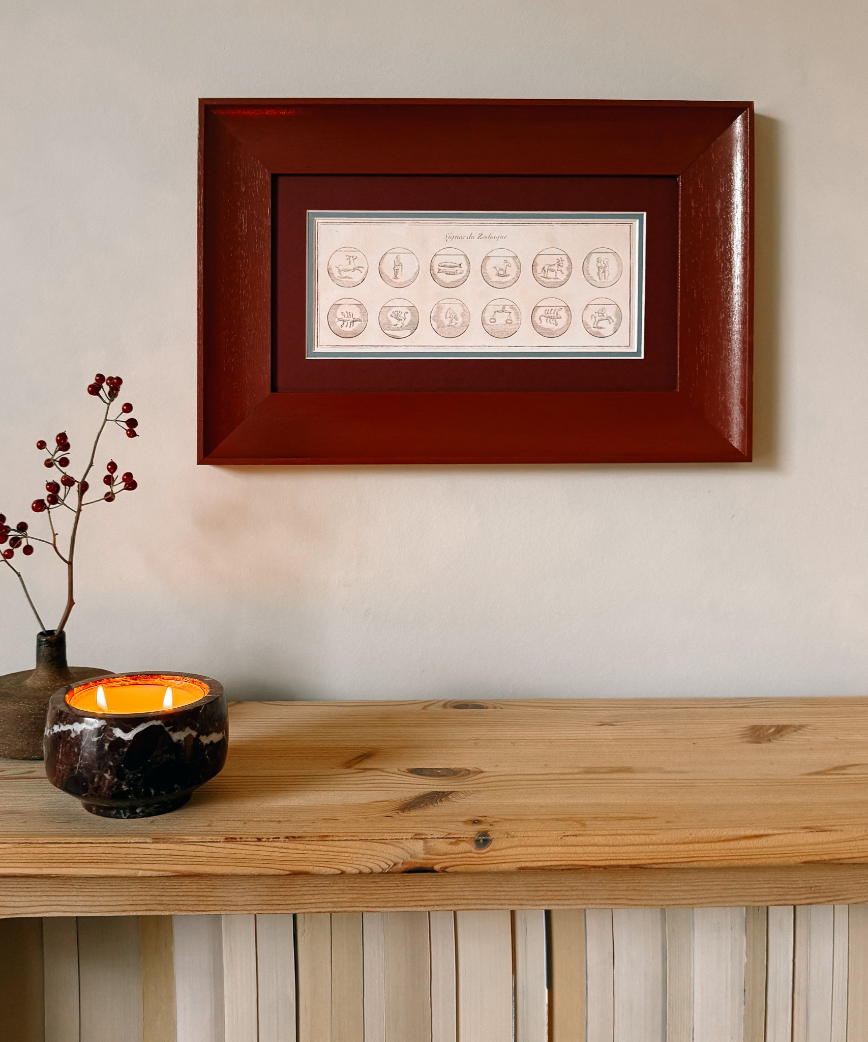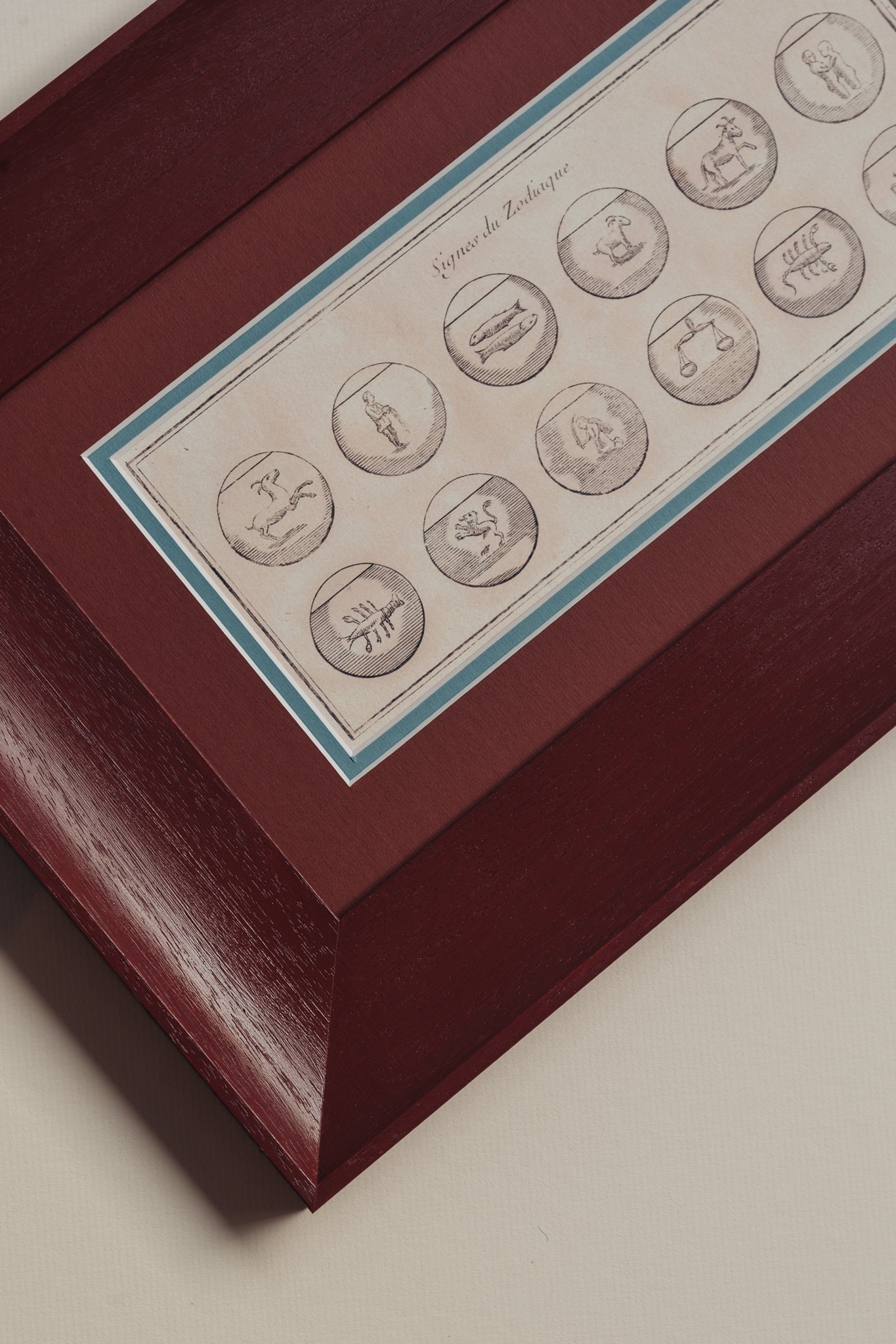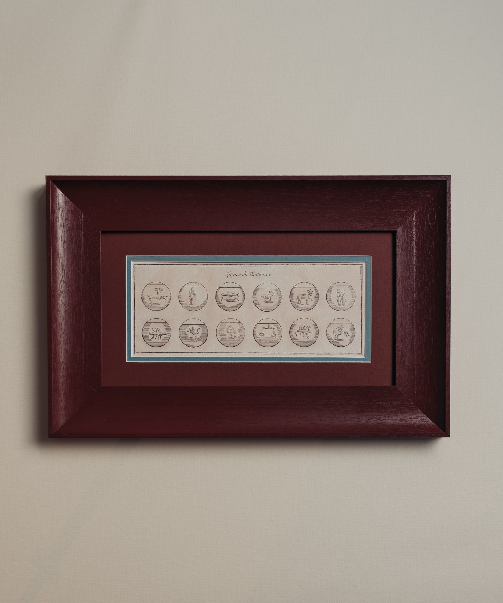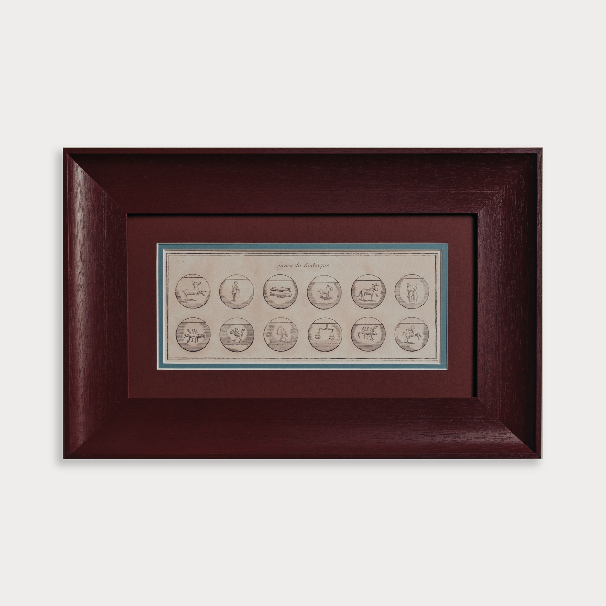 These beautiful Zodiac symbols date back to the early 1700s and we have restored and reprinted this to create a luxurious new interpretation. In a handmade frame with shallow scoop, hand painted in Farrow & Ball's Etruscan red with a tonal mount with a splash of deep muddy blue. The perfect gift for the star reader in your life or a treat for yourself!